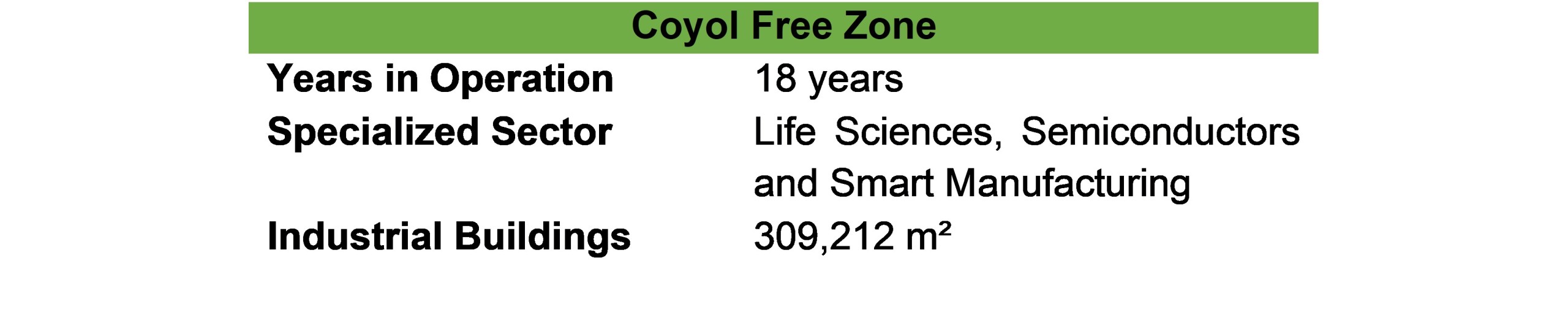 Coyol Free Zone has an area of 106 hectares, of which more than 100,000 m² are buildings under sustainable construction parameters with the LEED (Leadership in Energy and Environmental Design) certification scheme, internationally recognized by the U.S. Green Building Council (U.S. Green Building Council).